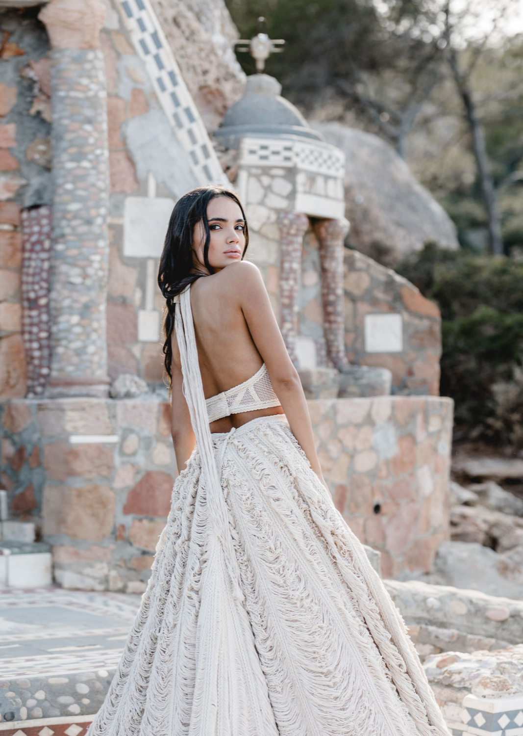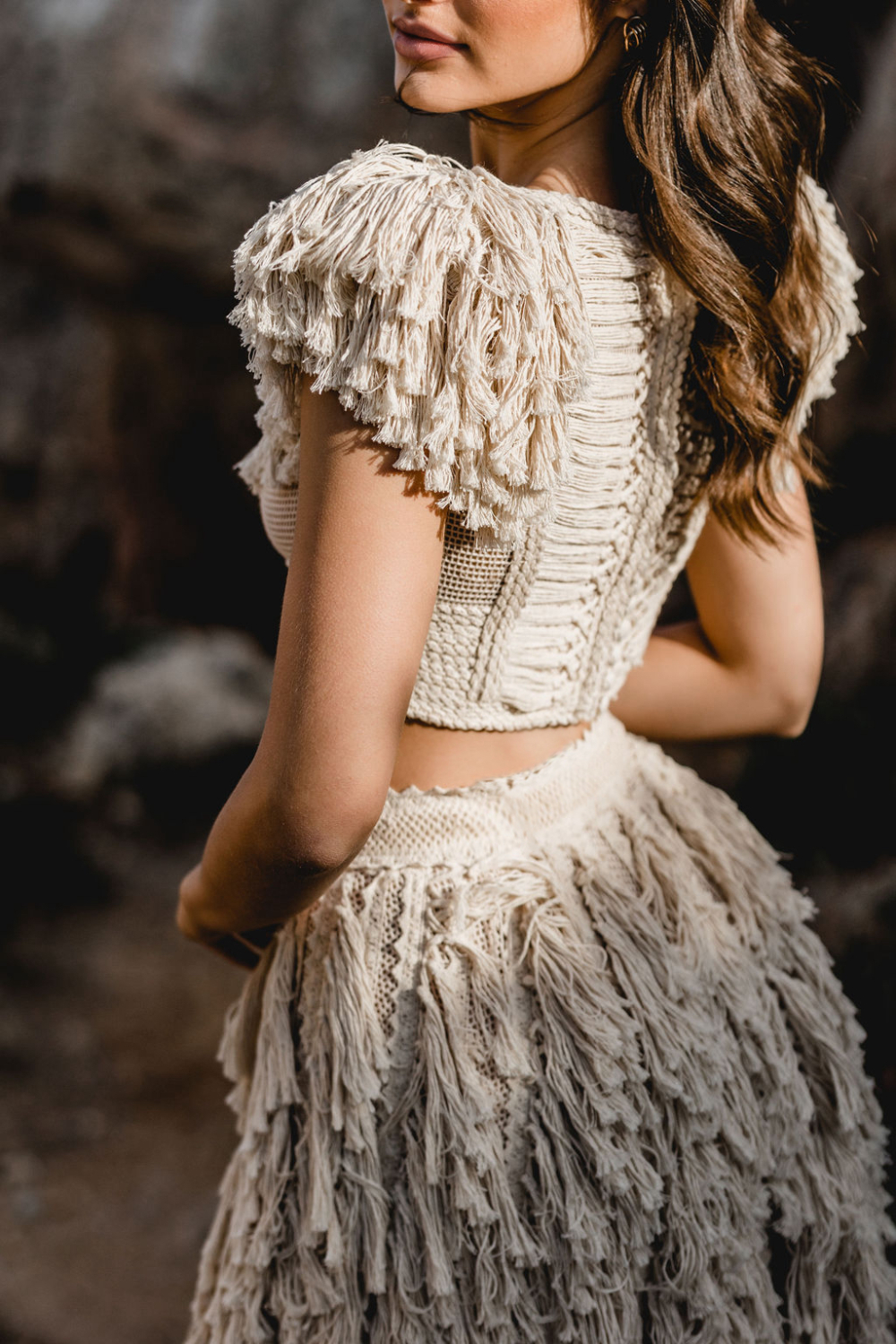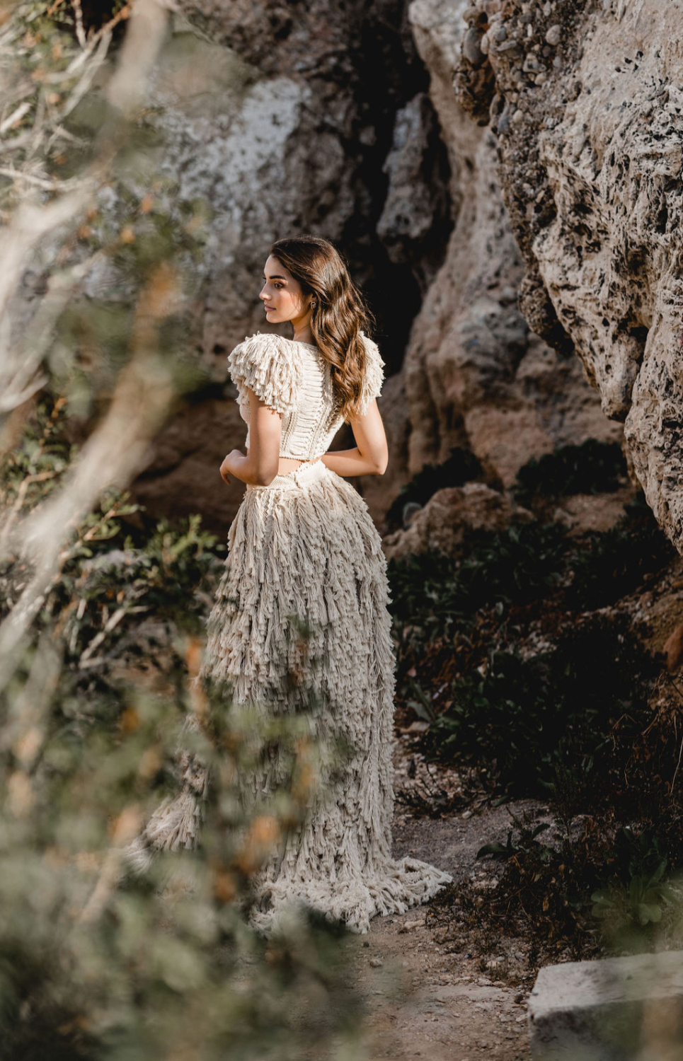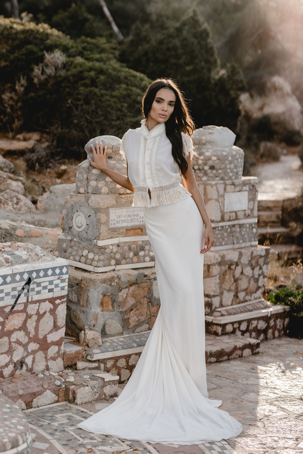 It is a look made for a bride who wants ease and drama at the same time. Soft fabric that catches the breeze, combined with a daring cut and a boho fringe bridal top that feels unmistakably Zolotas.