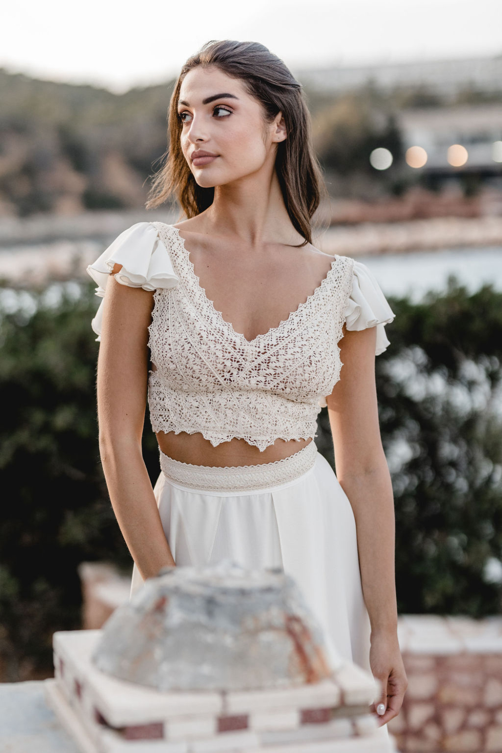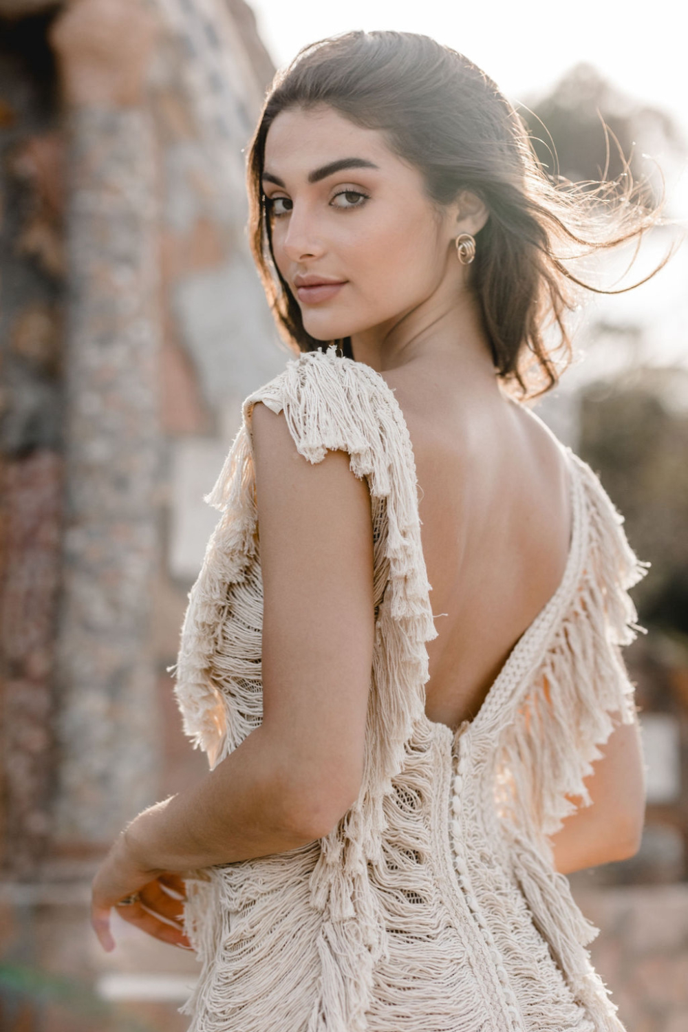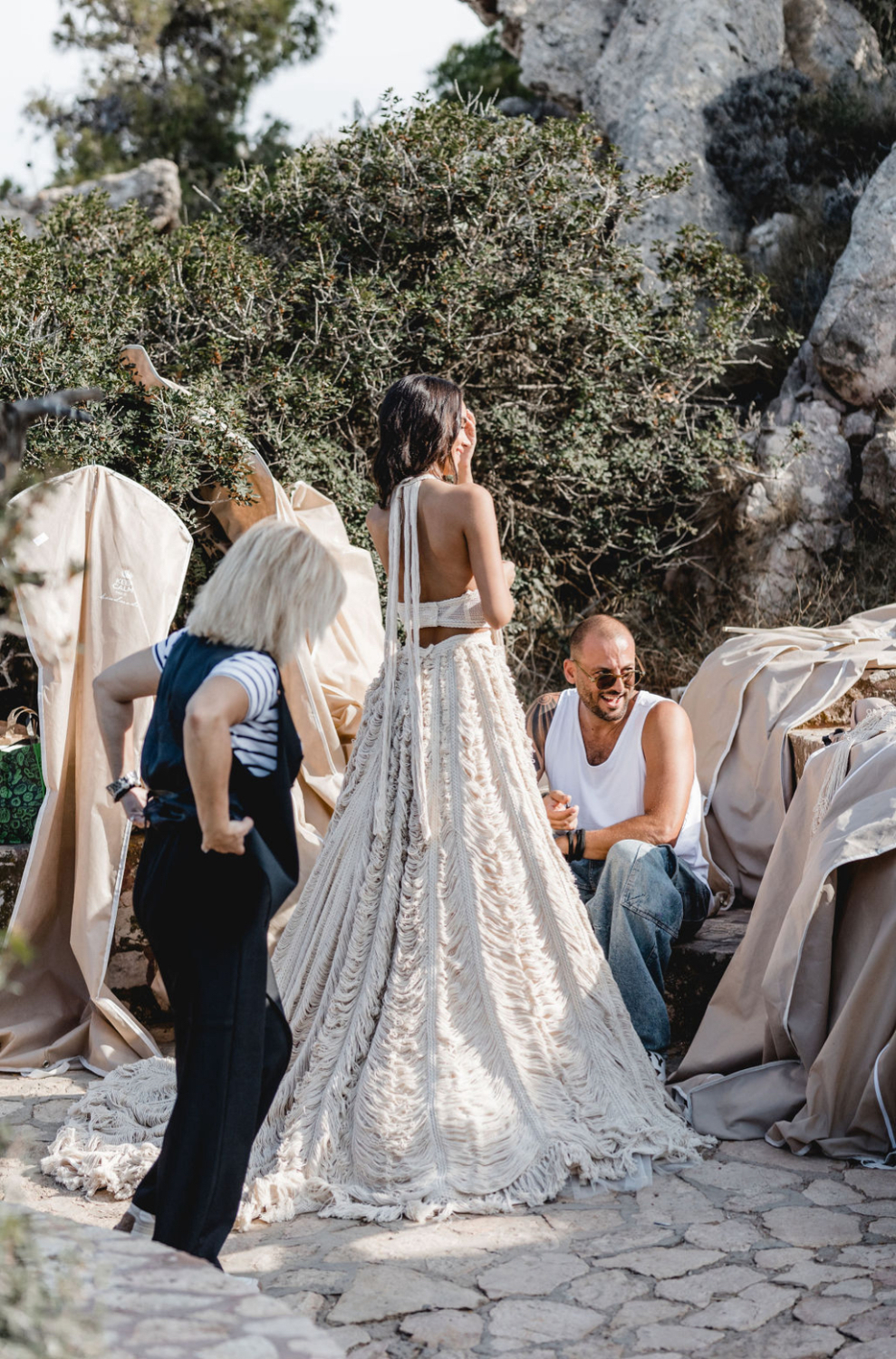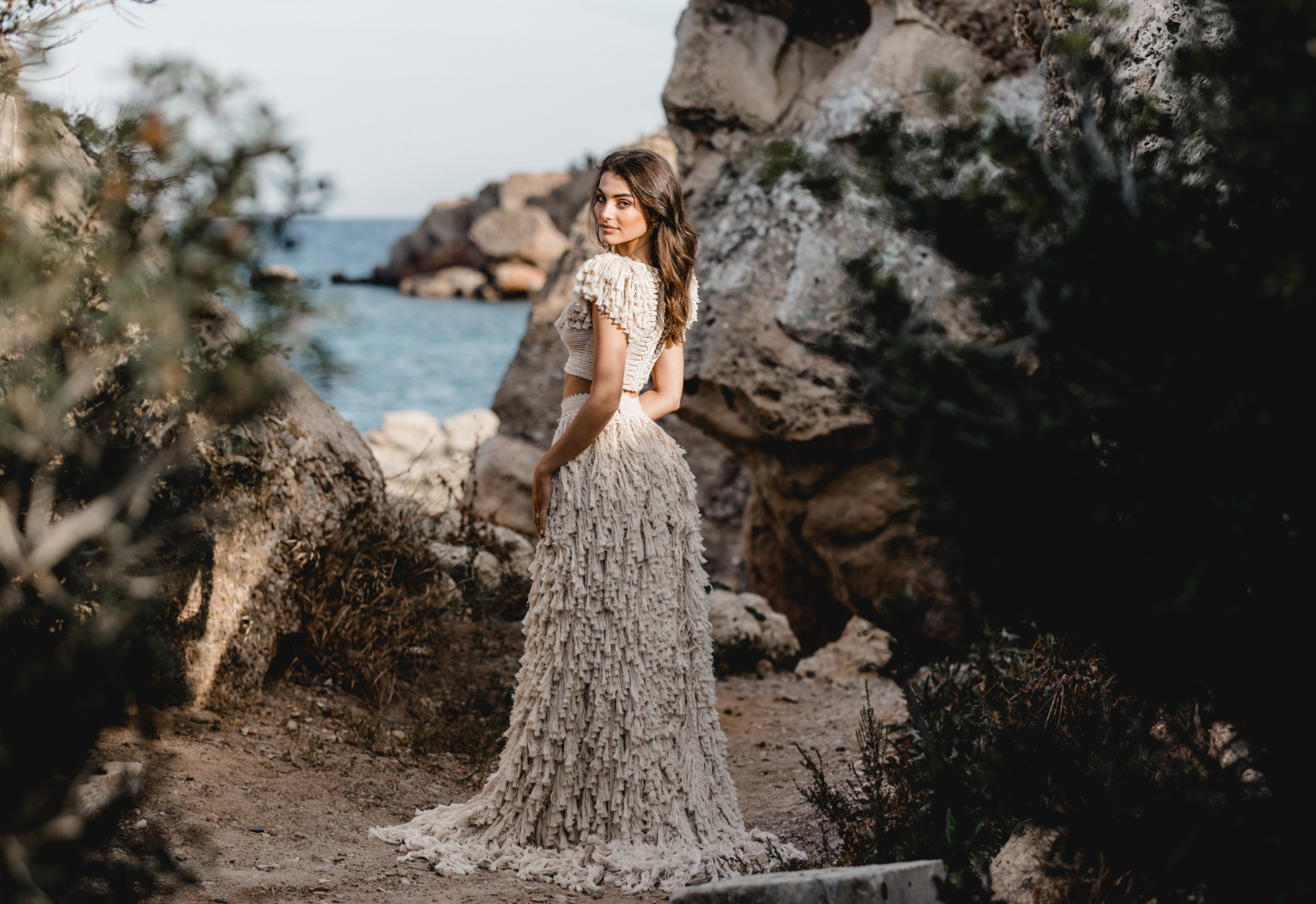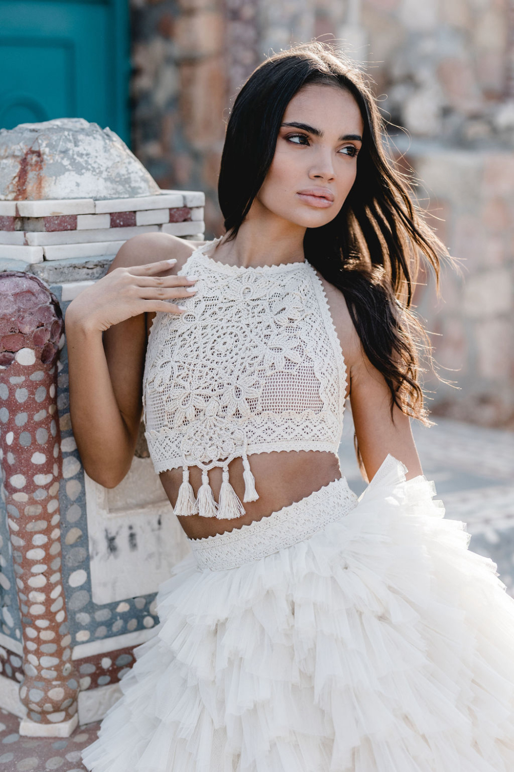 It is a look made for a bride who wants ease and drama at the same time. Soft fabric that catches the breeze, combined with a daring cut and a boho fringe bridal top that feels unmistakably Zolotas.