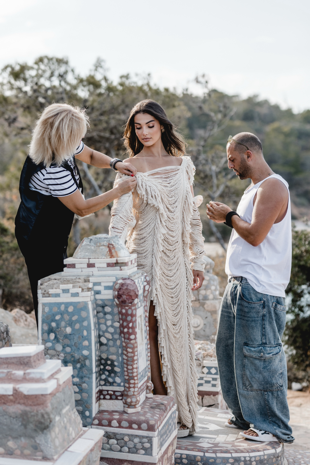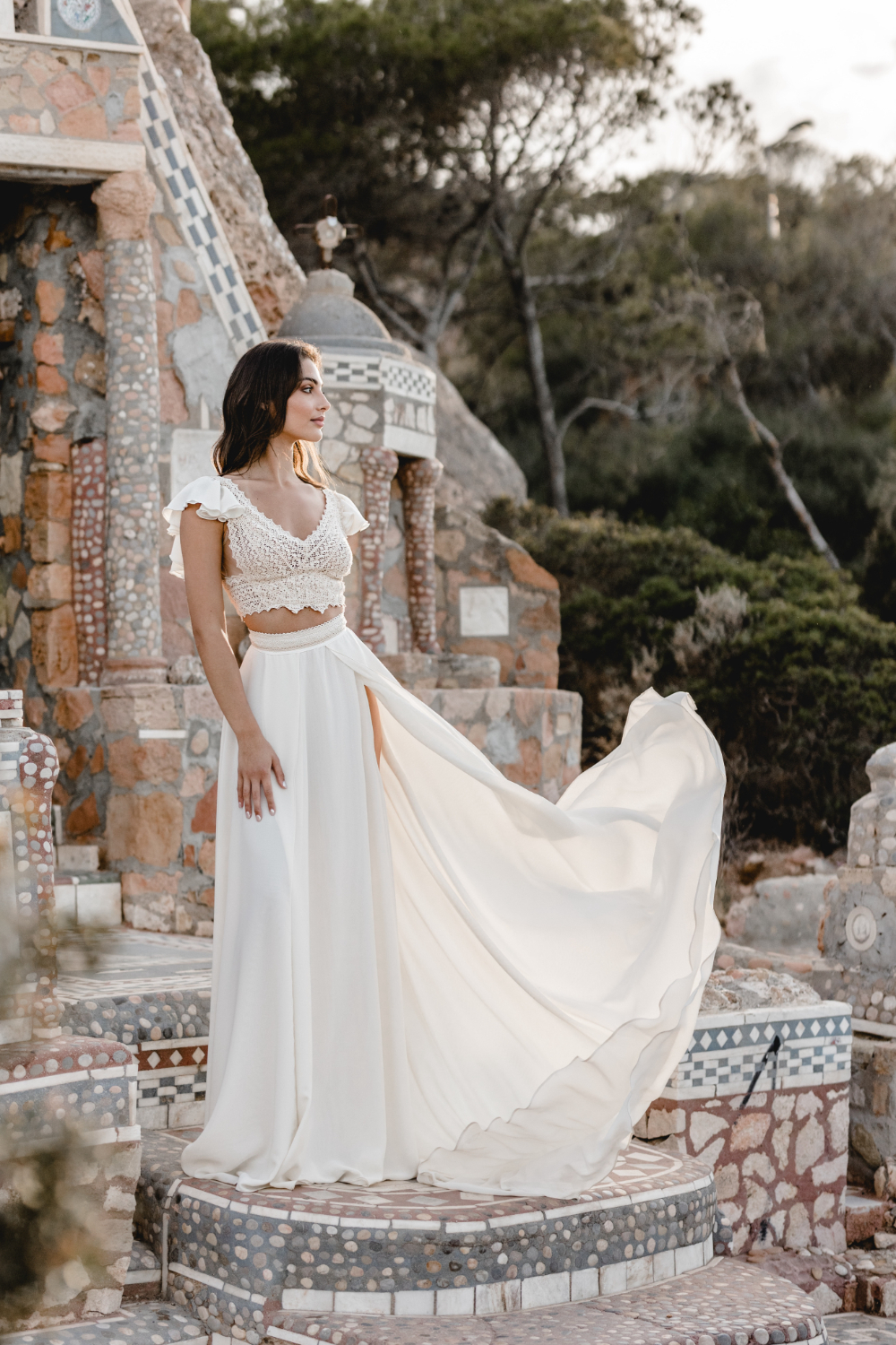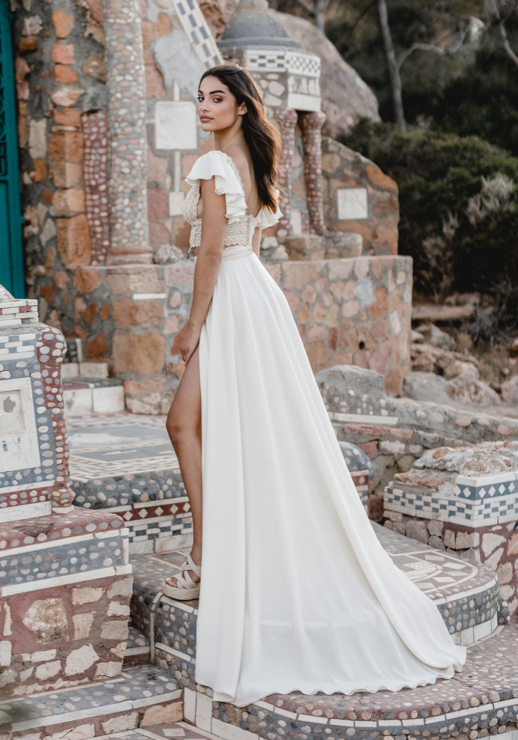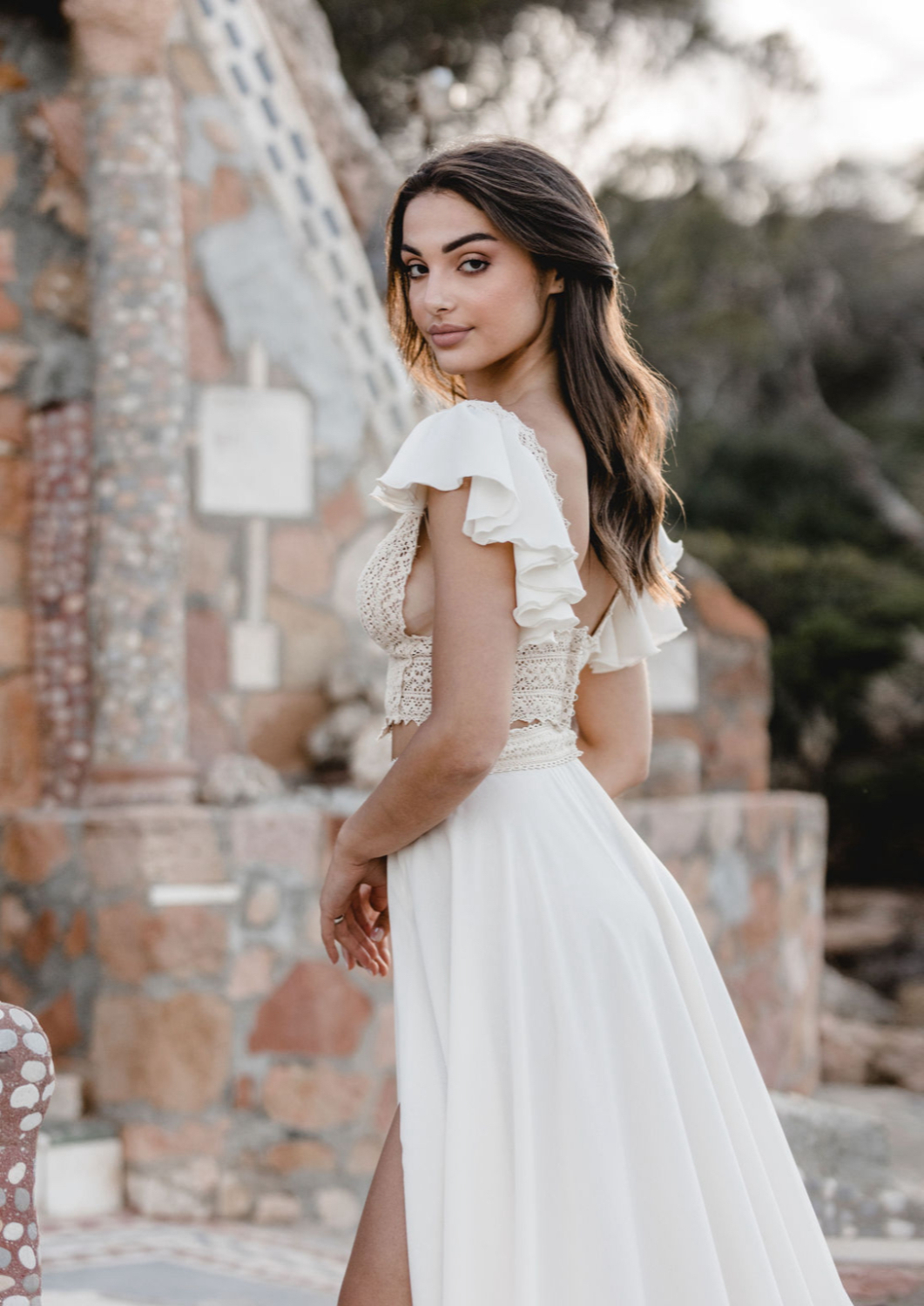 It is a look made for a bride who wants ease and drama at the same time. Soft fabric that catches the breeze, combined with a daring cut and a boho fringe bridal top that feels unmistakably Zolotas.