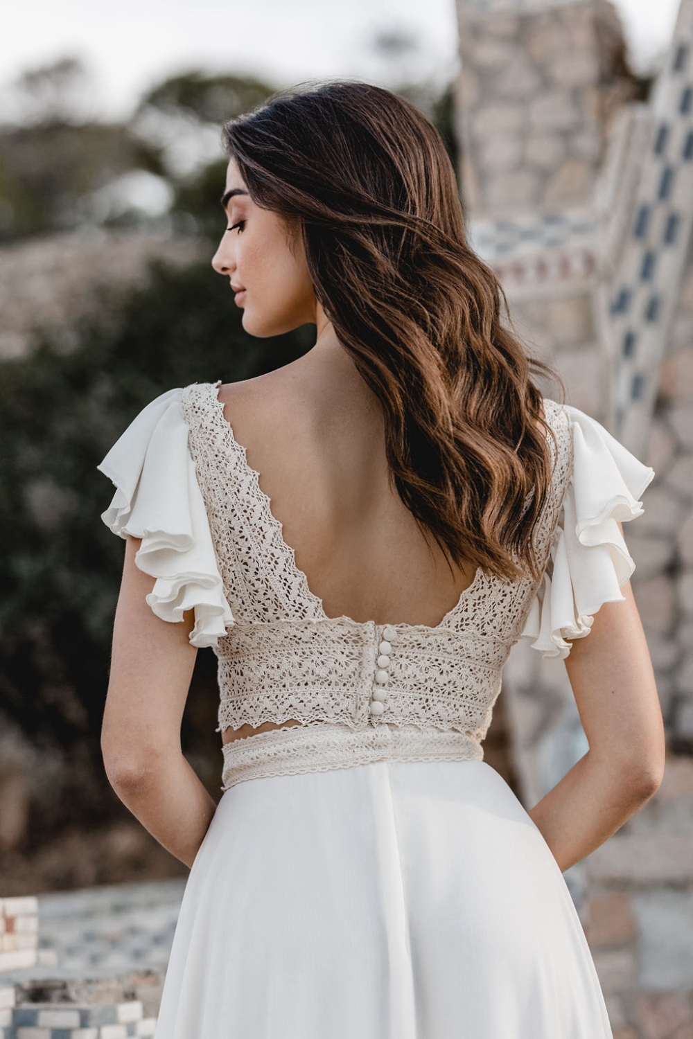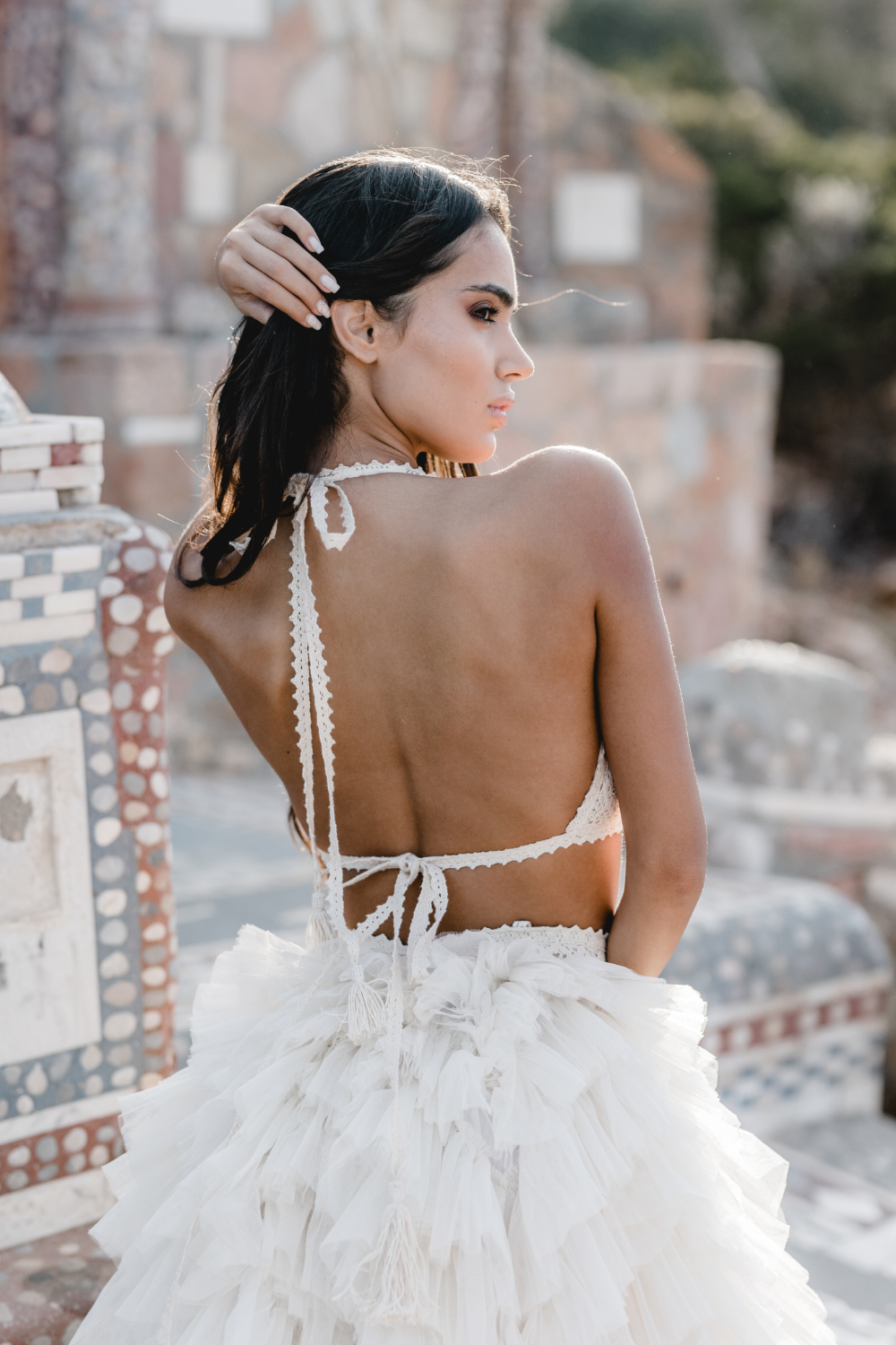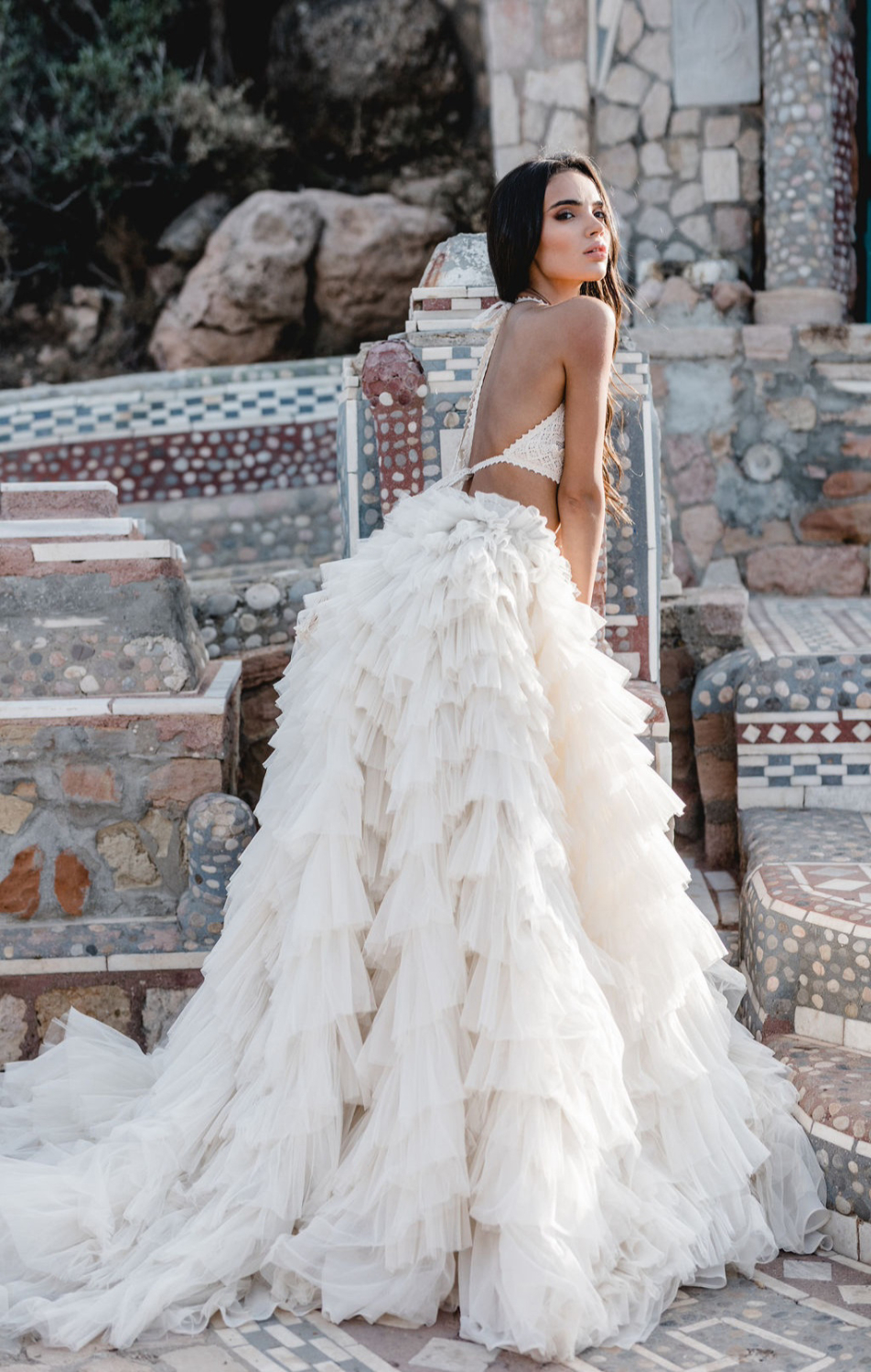 Another key look pairs a voluminous ruffle tulle bridal skirt with the backless Ophelia top. The top reveals the back with confidence, framed by carefully placed lace, while the skirt builds a soft cloud of tulle around the bride.