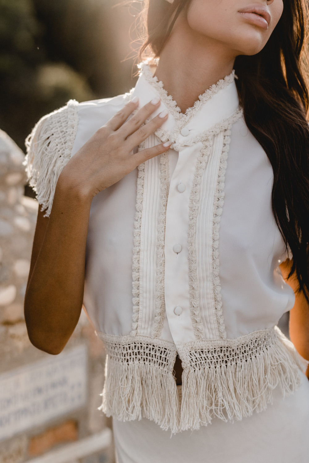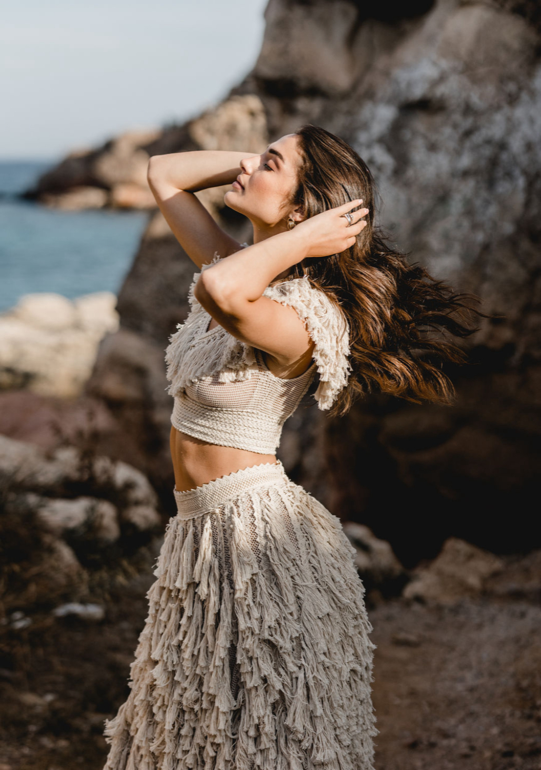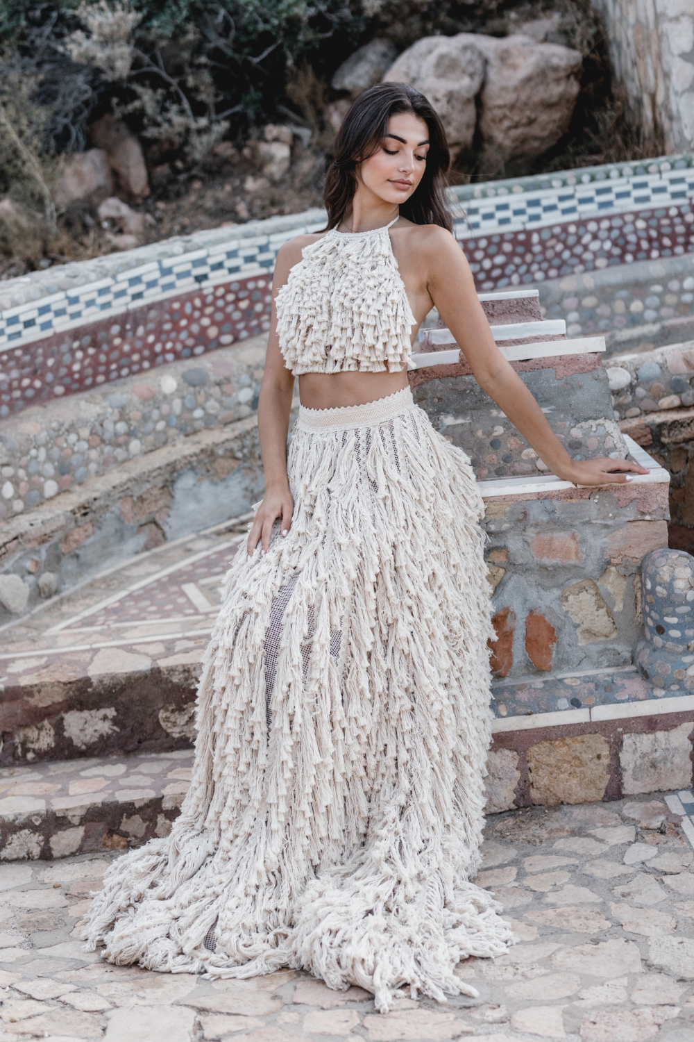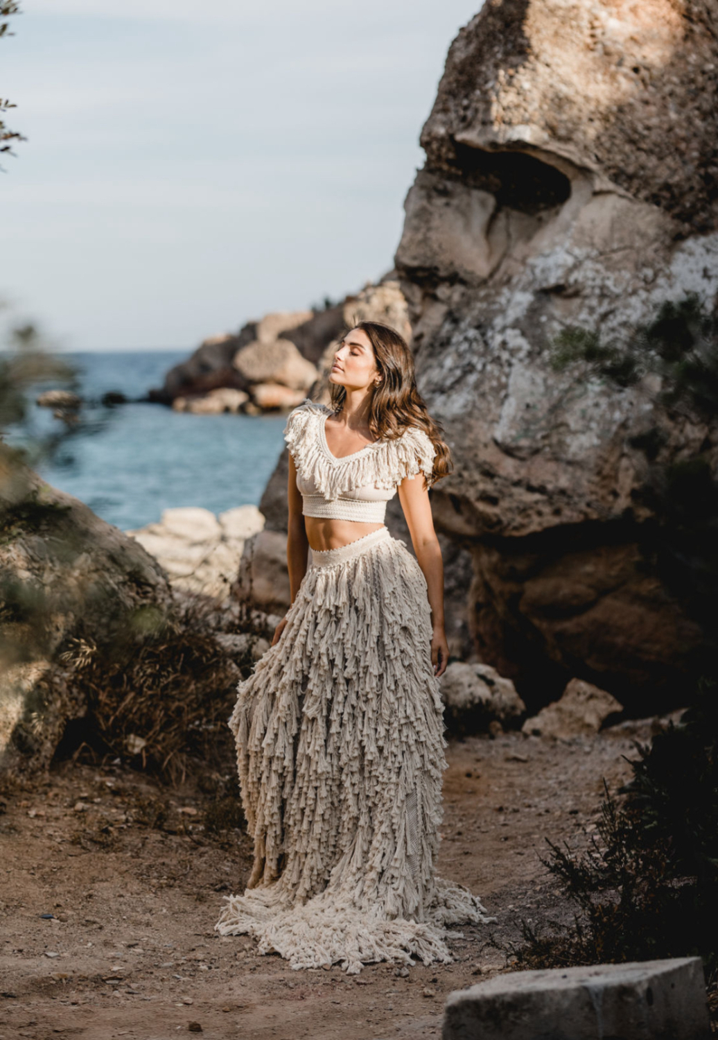 One of the freshest looks of the campaign is the Nea top paired with a flowing muslin skirt. The top embraces the boho fringe language with handcrafted texture, while the skirt opens in a bold slit that reveals the leg in movement.