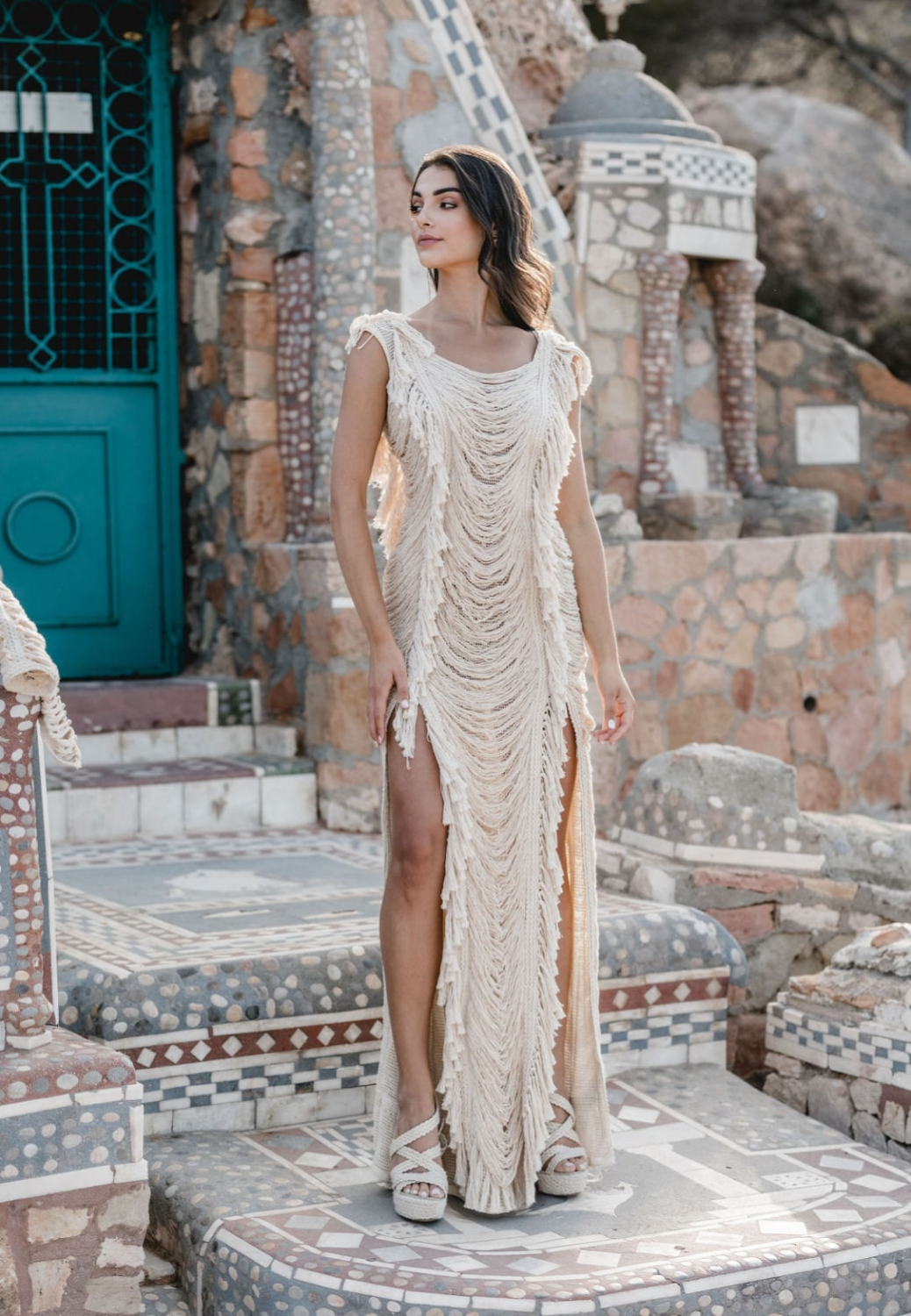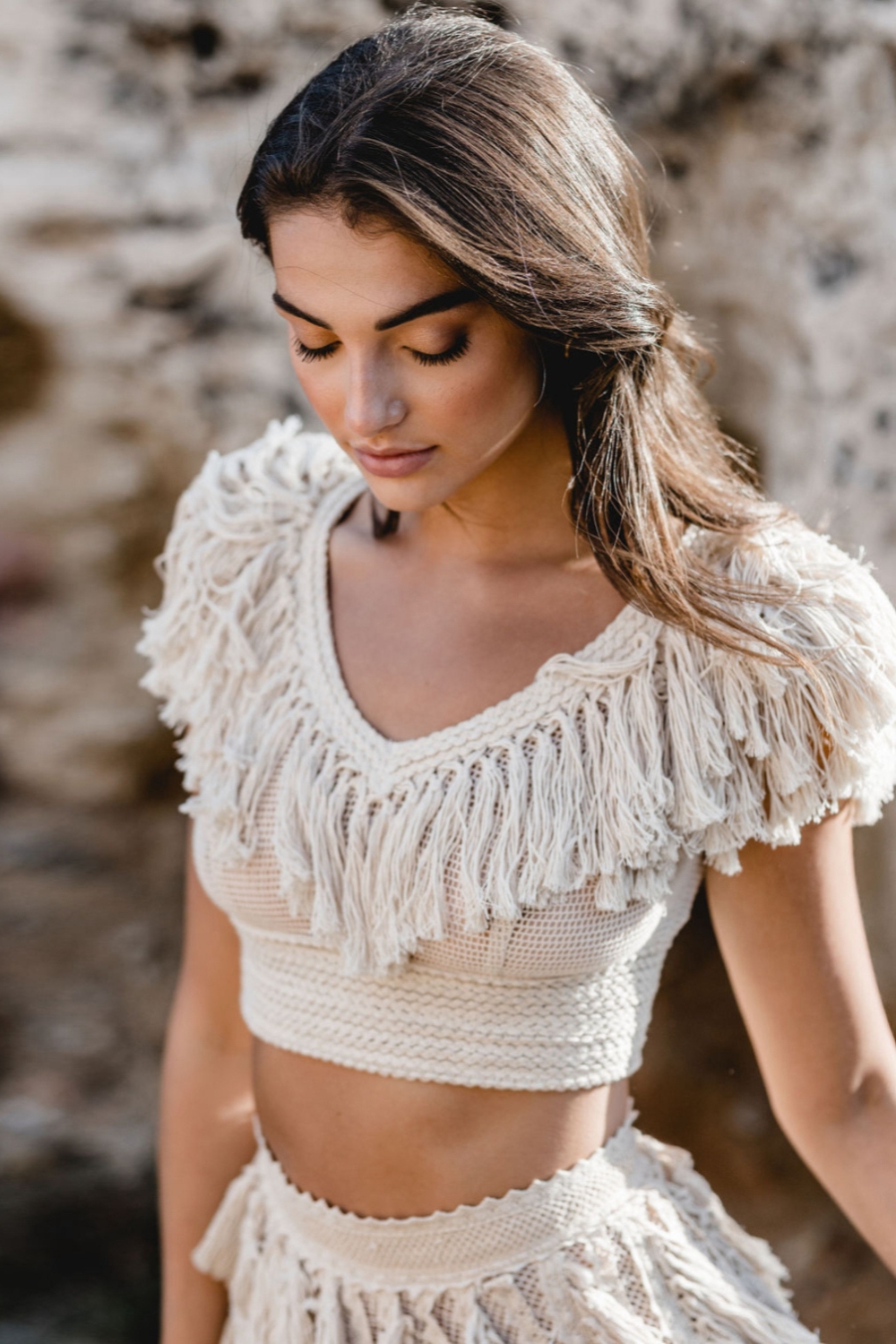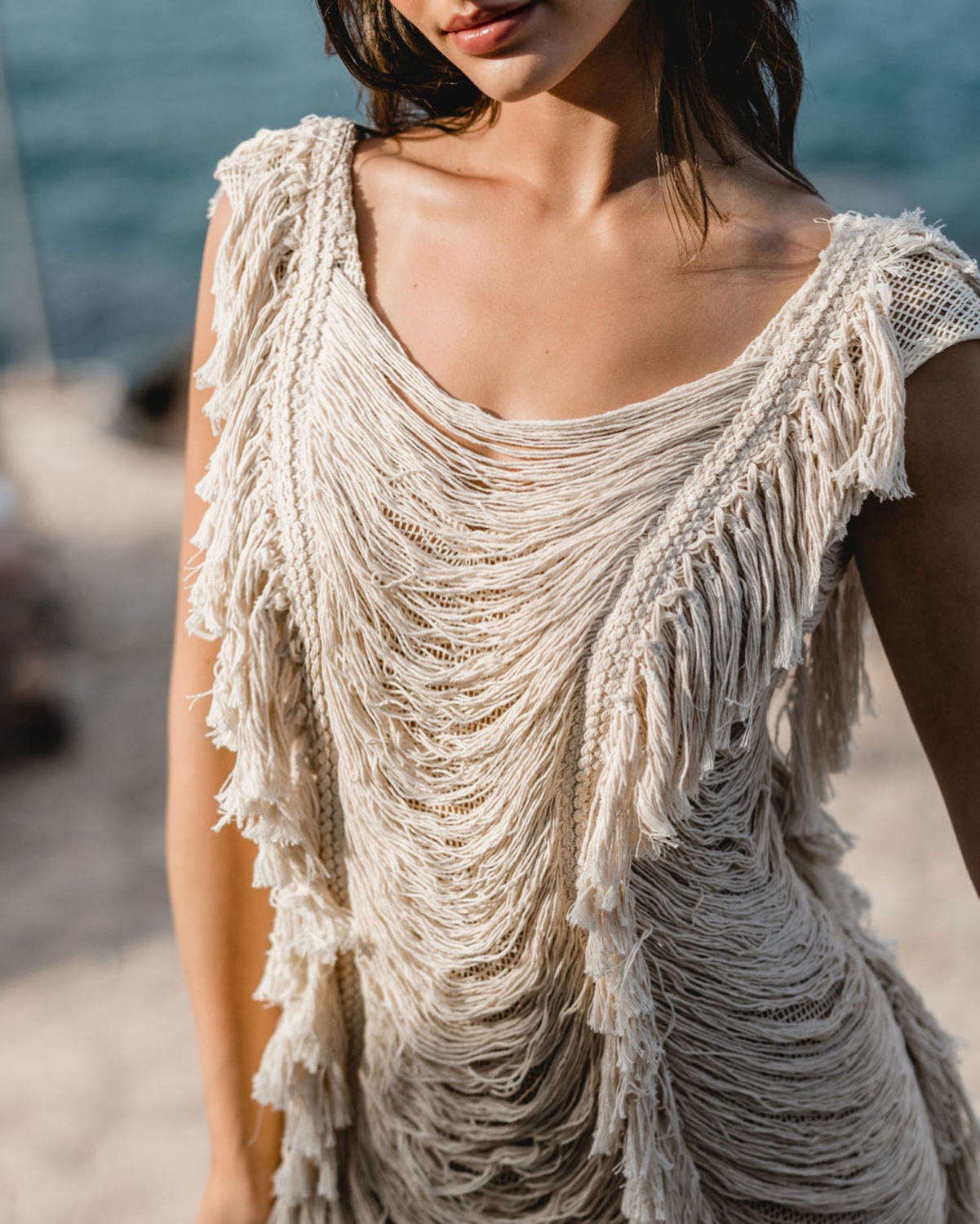 One of the freshest looks of the campaign is the Nea top paired with a flowing muslin skirt. The top embraces the boho fringe language with handcrafted texture, while the skirt opens in a bold slit that reveals the leg in movement.