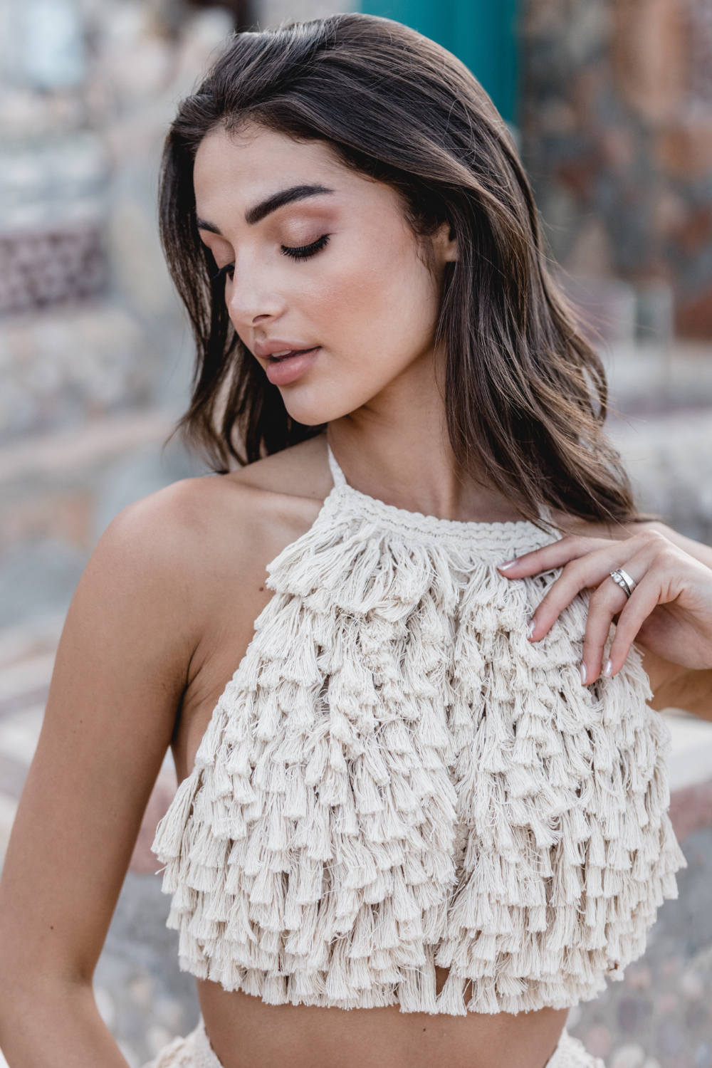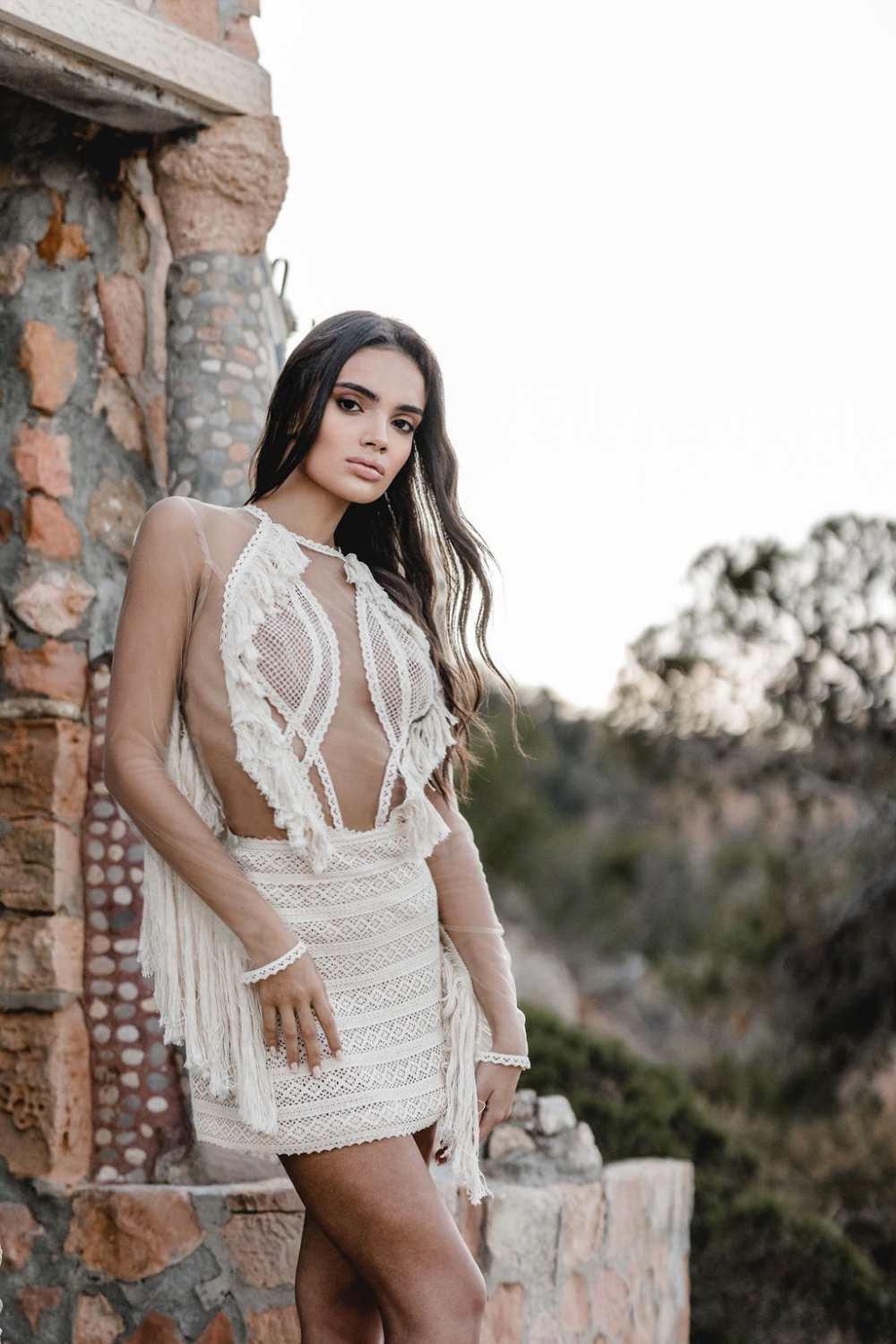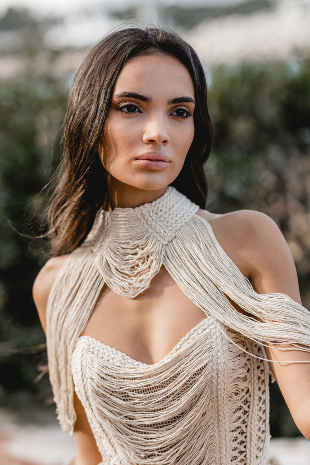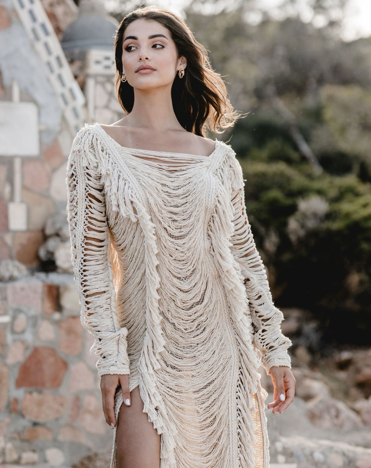 One of the freshest looks of the campaign is the Nea top paired with a flowing muslin skirt. The top embraces the boho fringe language with handcrafted texture, while the skirt opens in a bold slit that reveals the leg in movement.