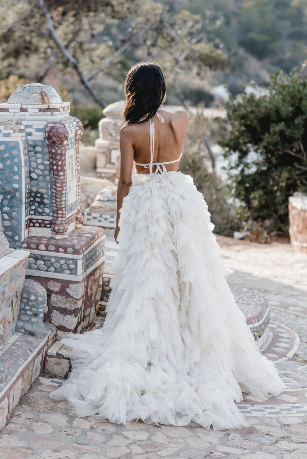 There is a delicate tension between airiness and strength. The backless Ophelia top feels modern and free, while the full skirt brings drama worthy of couture.