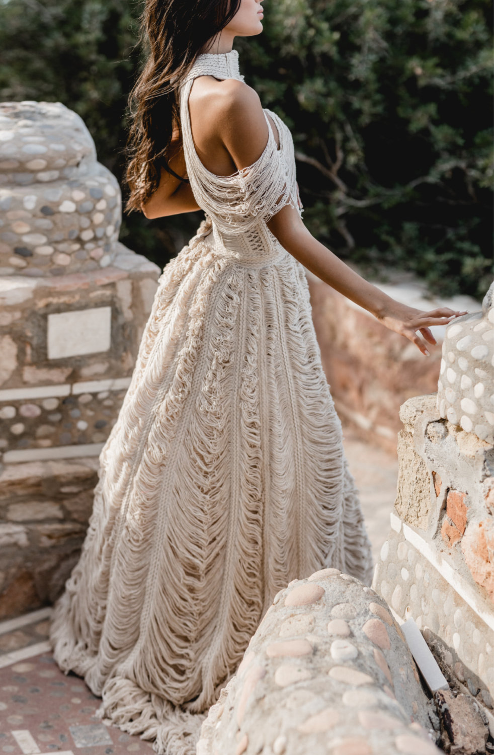 The Maraya gown is all about sculpted presence. Voluminous shoulders frame the neckline, creating a strong yet feminine line. At the back, intricate woven tassels form a striking contrast with the neat couture details of a row of covered buttons with rouleau loops. It is a pure haute couture reference, reimagined through a boho fringe lens.