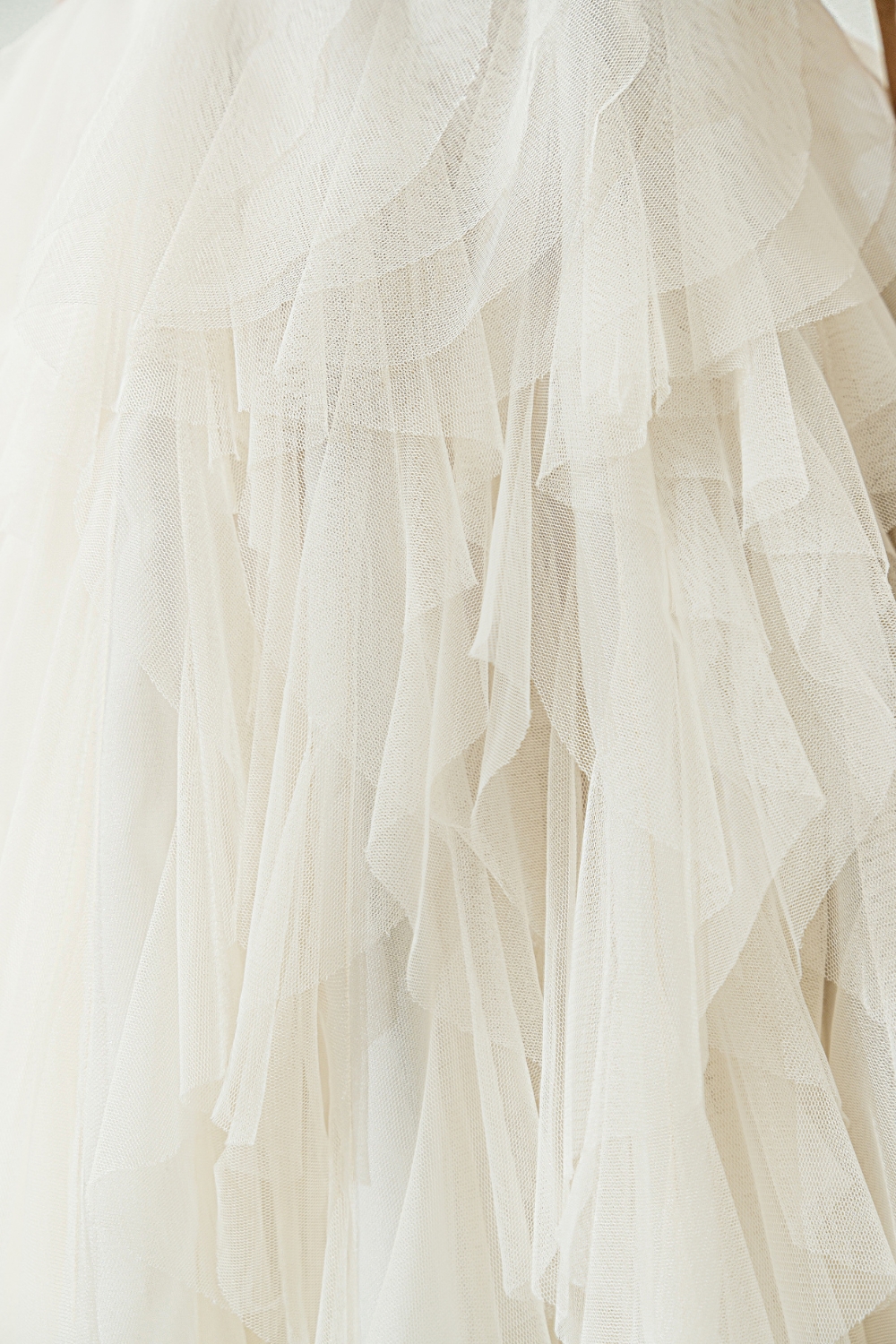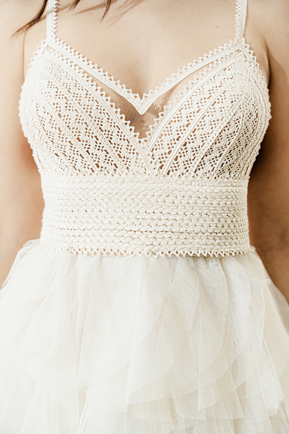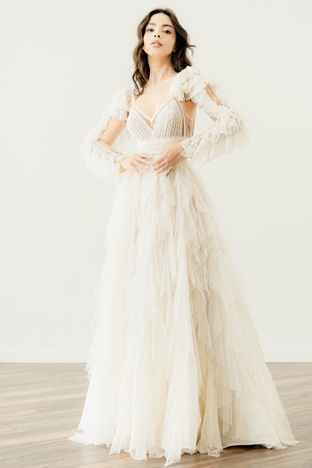 From the hand-knitted crochet bodice to the flowy tiered tulle, it’s all crafted in-house at Atelier Zolotas. And the best part? It comes with two detachable sleeve styles—ethereal tulle wings or bold layered cuffs. Keep it sleeveless, or mix it up throughout the day. You’re not just getting a dress. You’re getting a style evolution.The bodice is structured yet soft, with transparency illusions on the back and under the arms. A wide crochet waistband sculpts the figure, while the skirt does what it was born to do—move. Layers of light ruffles ripple as you walk, creating that effortless bridal sway.