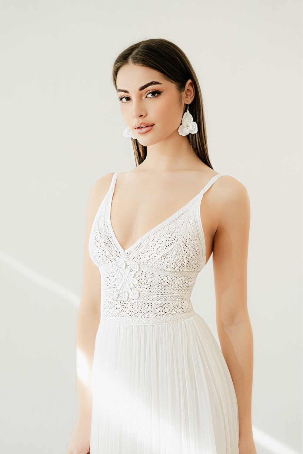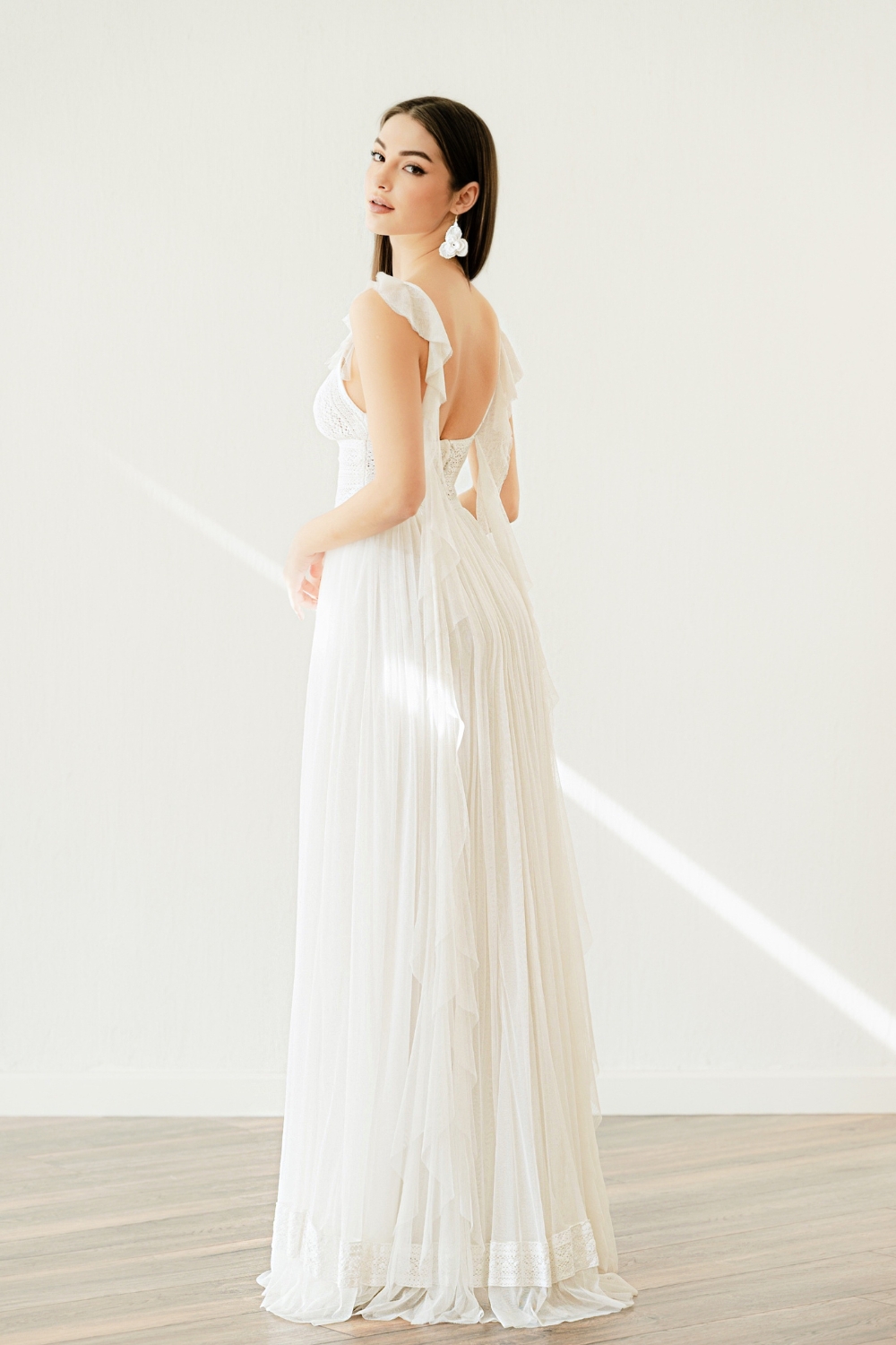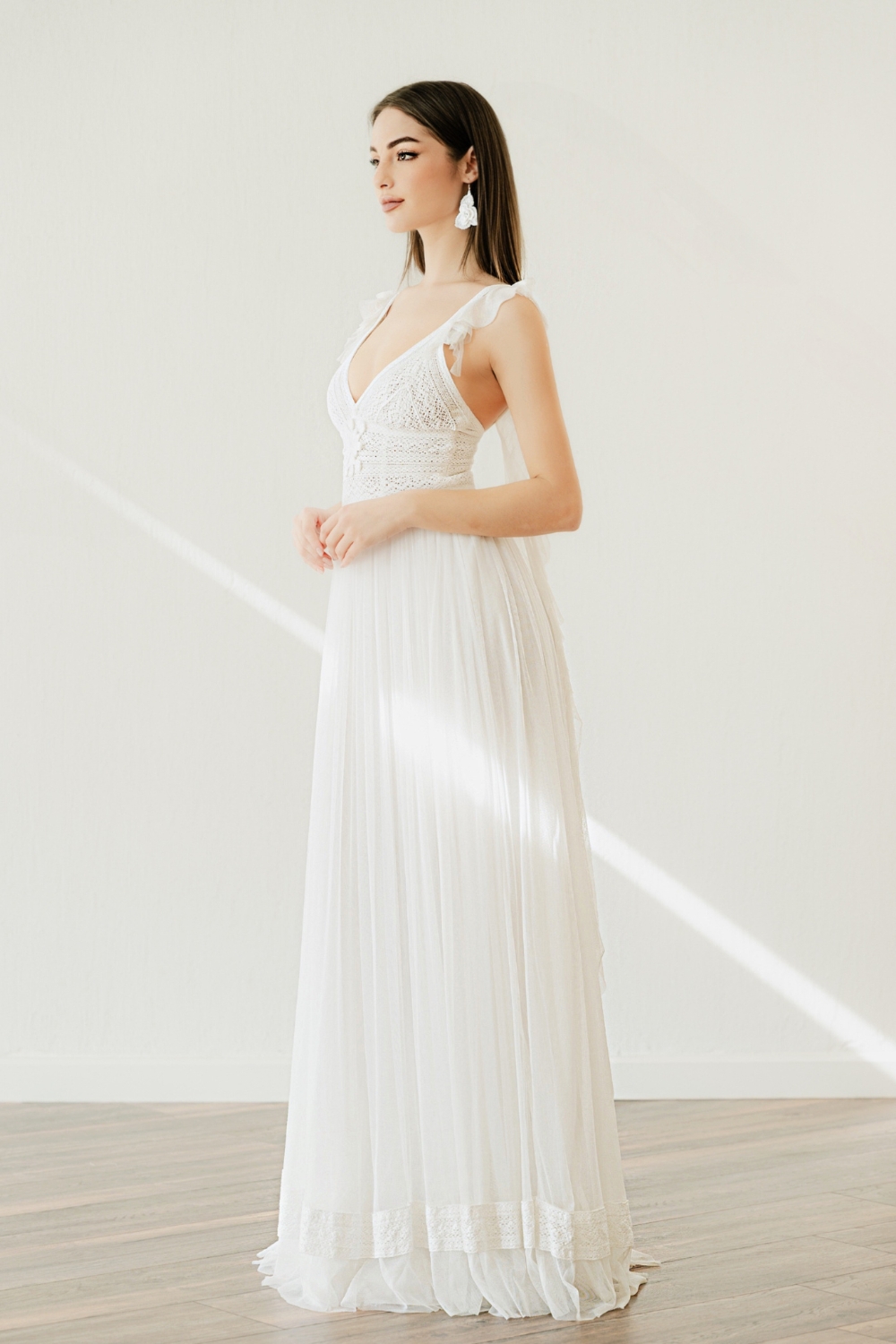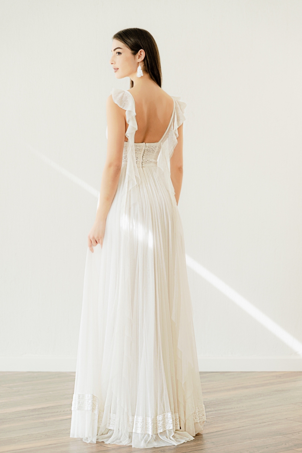 The detachable tulle applied to the thin straps of the wedding dress, fastened with invisible clips if desired, truly sets Eva apart. Starting above the chest, following the straps, it hangs freely until the waist of the tulle skirt. As a result, the ethereal ruffle adds a charming touch of romance, what we like to call ‘boho-mantic!’