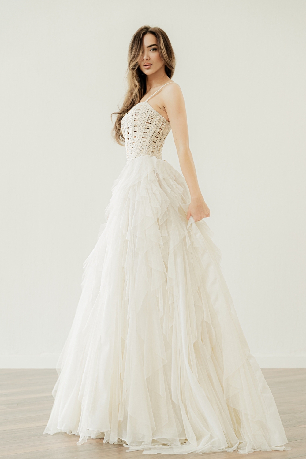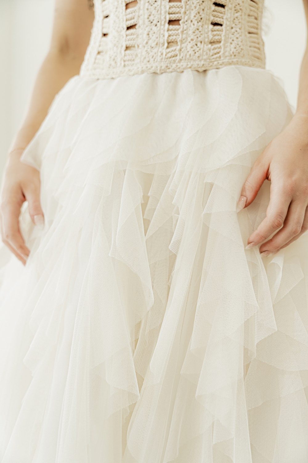 Below, a full A-line skirt made of soft tulle -the renowned Apollonia. Sculpted with scissors, layer by layer, it carries the movement of haute couture. Light, breathable, and unrestrained, it’s ideal for destination weddings around the world.