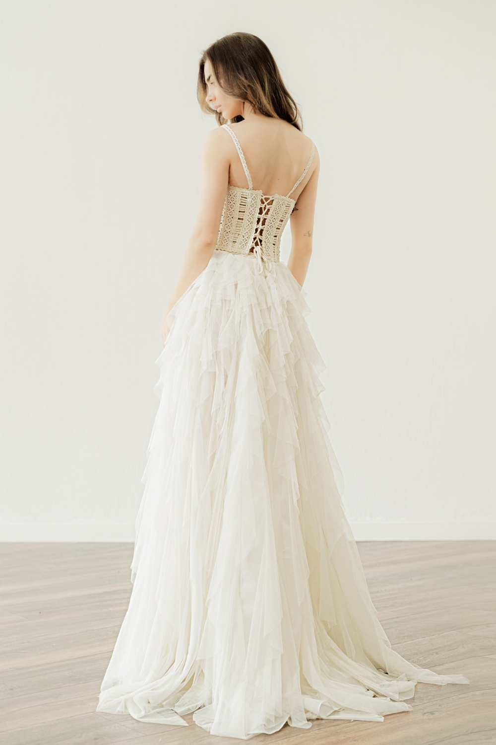 Designed by Vg Zolotas, this 2-piece boho corset wedding dress brings bold romance to life. The bodice? A structured work of art. Boned, laced, and sculpted with cotton cord, it hugs the body with precision and presence. The subtle transparency draws the eye to the silhouette—elongating it in the most flattering way. Thin, delicate lace straps provide light support, while the lace-up back adds a custom fit—and just the right amount of drama.