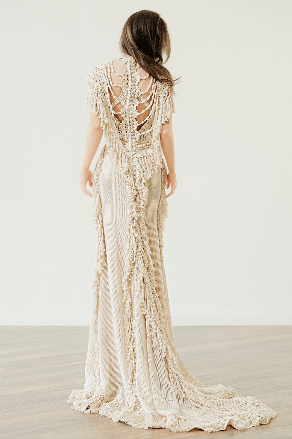 Login to see pricesDiscover Cressida by Atelier Zolotas—a breathtaking handmade design that redefines crochet lace wedding dresses. Sculpted fit, impressive fringe, and jaw-dropping back details.